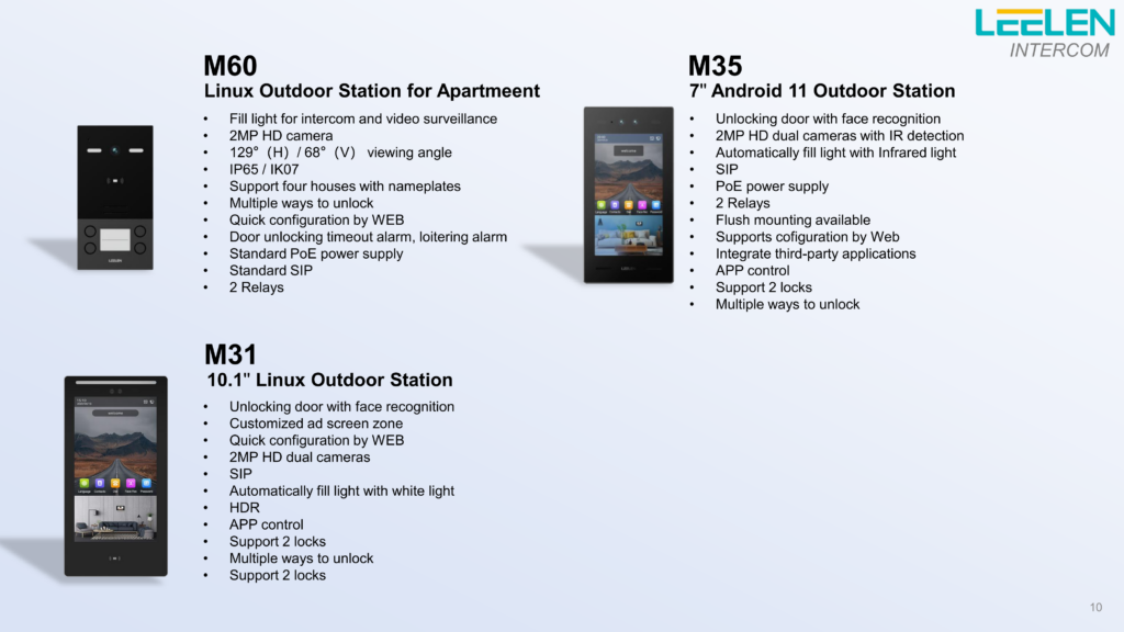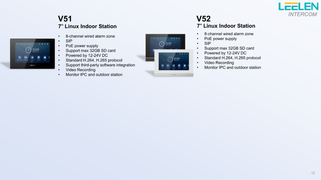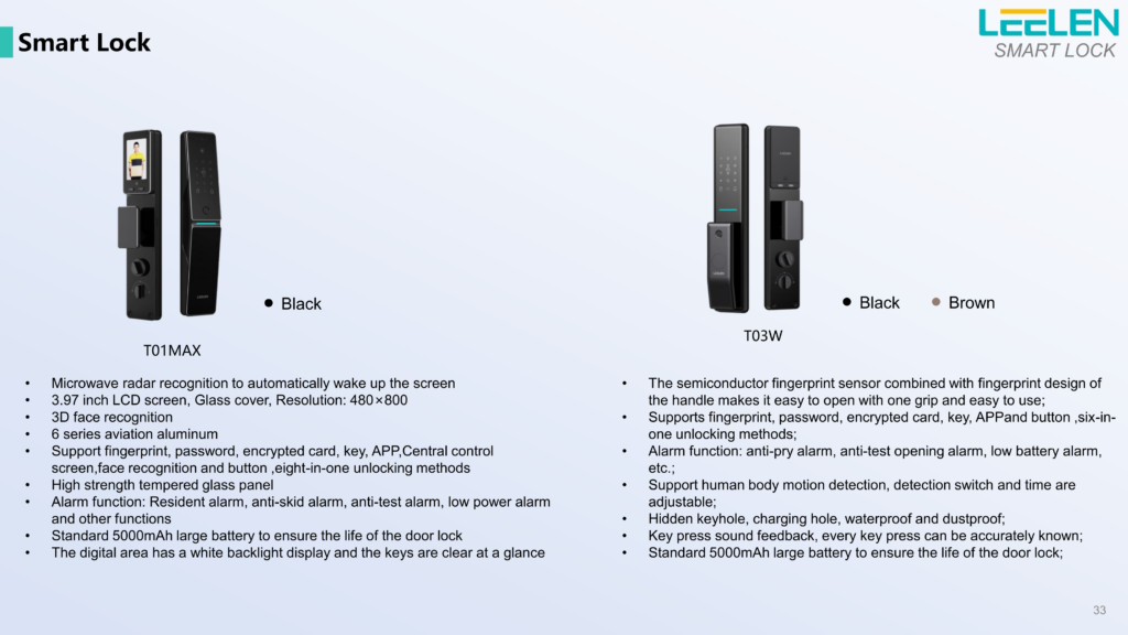 | T01 V | — | 1 مگاپیکسل (720P) | 97.8° عمودی، 54° افقی، 113.8° مورب | آلومینیوم صنعت هوایی سری ۶ | تشخیص سهبعدی چهره، اثرانگشت، رمز، کارت، کلید، صفحه پشتی، اپ | ✓ | اتصال دائمی | باتری لیتیوم 5000mAh (7.4V) | ✓ |