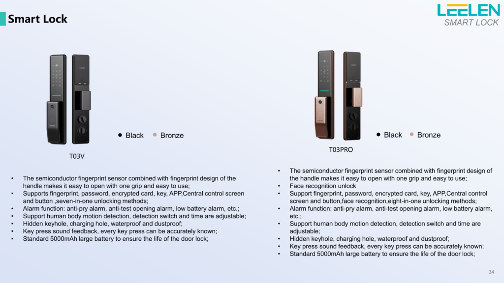 | T03 V | — | 1 مگاپیکسل (720P) | 130° عمودی، 71° افقی | آلومینیوم آلیاژی | اثرانگشت، رمز، کارت، کلید، صفحه پشتی، اپ | ✓ | اتصال دائمی | باتری لیتیوم 5000mAh (7.4V) | ✓ |