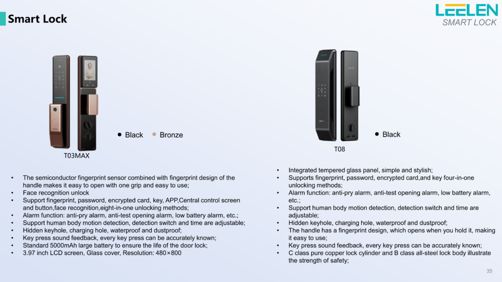 | T01 Pro | — | 1 مگاپیکسل (720P) | 97.8° عمودی، 54° افقی، 113.8° مورب | آلومینیوم صنعت هوایی سری ۶ | تشخیص سهبعدی چهره، اثرانگشت، رمز، کارت، کلید، صفحه پشتی | ✓ | اتصال دائمی | باتری لیتیوم 5000mAh (7.4V) | ✓ |