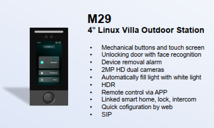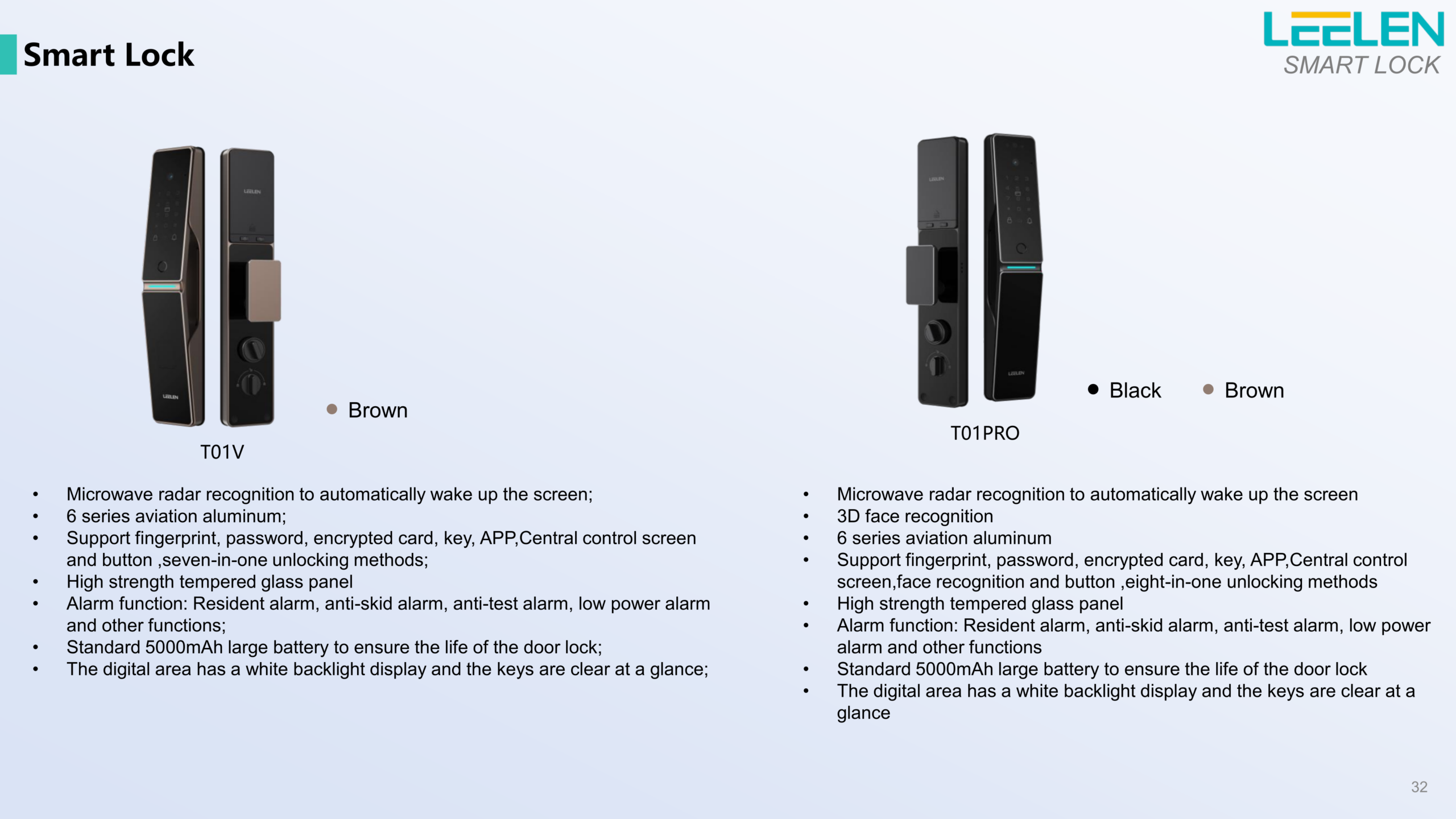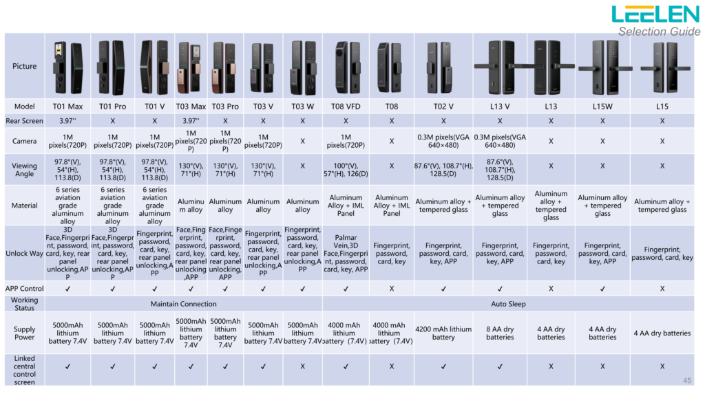 | T01 V | — | 1 مگاپیکسل (720P) | 97.8° عمودی، 54° افقی، 113.8° مورب | آلومینیوم صنعت هوایی سری ۶ | تشخیص سهبعدی چهره، اثرانگشت، رمز، کارت، کلید، صفحه پشتی، اپ | ✓ | اتصال دائمی | باتری لیتیوم 5000mAh (7.4V) | ✓ |