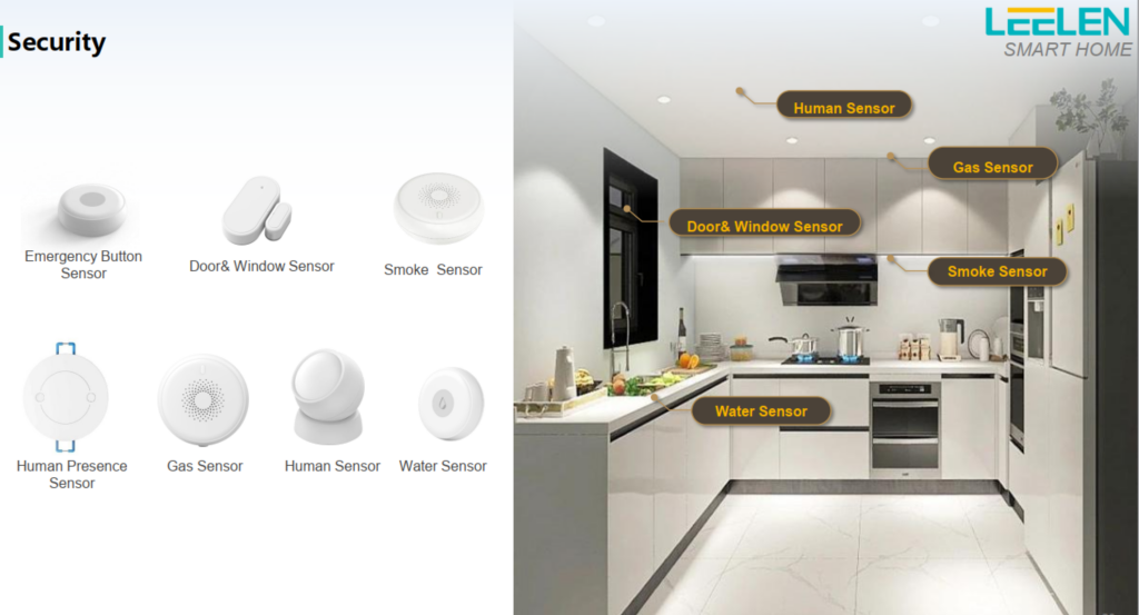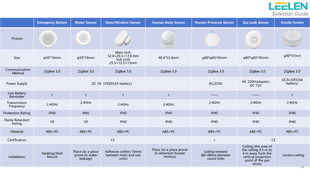 | سنسور نشت گاز | ![Gas Leak Sensor] | قطر ۹۰ میلیمتر × ارتفاع ۶۵ میلیمتر × عمق ۴۵ میلیمتر | ZigBee 3.0 | آداپتور AC 220V | — | 2.4 گیگاهرتز | IP40 | IP40 | ABS+PC | CE | نصب روی سقف (در ناحیهای از سقف که ۰.۵ تا ۴ متر از نقطه عمودی اجاق گاز فاصله دارد) |