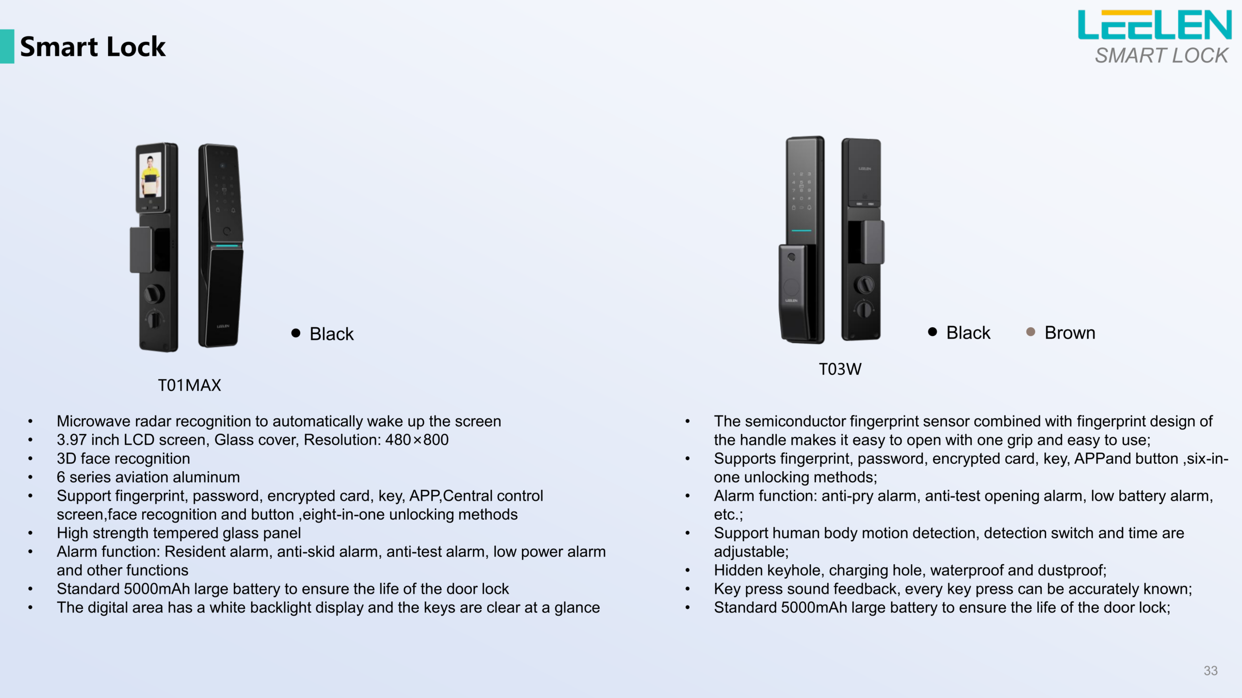 | T01 Max | 3.97 اینچ | 1 مگاپیکسل (720P) | 97.8° عمودی، 54° افقی، 113.8° مورب | آلومینیوم صنعت هوایی سری ۶ | تشخیص سهبعدی چهره، اثرانگشت، رمز، کارت، کلید، صفحه پشتی، اپ | ✓ | اتصال دائمی | باتری لیتیوم 5000mAh (7.4V) | ✓ |