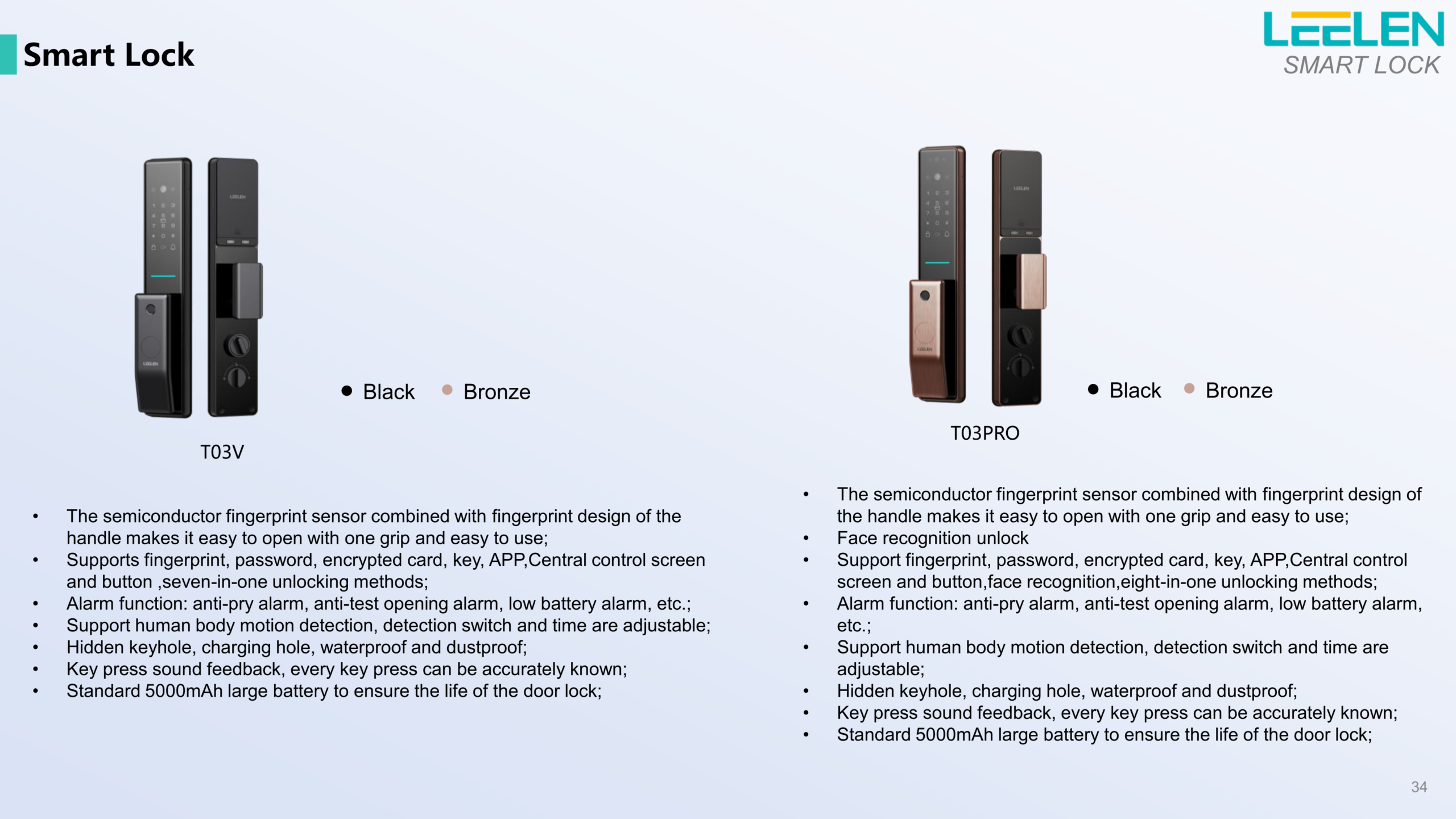 | T03 Pro | — | 1 مگاپیکسل (720P) | 130° عمودی، 71° افقی | آلومینیوم آلیاژی | اثرانگشت، رمز، کارت، کلید، صفحه پشتی، اپ | ✓ | اتصال دائمی | باتری لیتیوم 5000mAh (7.4V) | ✓ |