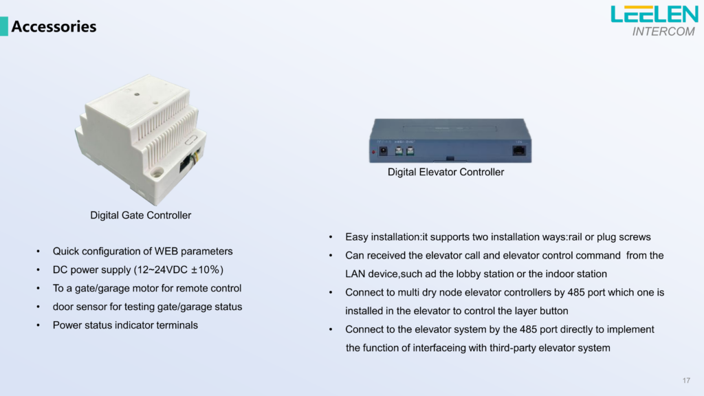 این کنترلر پل ارتباطی بین سیستم هوشمند LEELEN و سیستم آسانسور ساختمان است. نصب آن آسان بوده و از دو روش ریل یا پیچهای پلاگین پشتیبانی میکند. عملکرد اصلی آن، دریافت فراخوان (کال) و فرمان کنترل آسانسور از دستگاههای موجود در شبکه محلی (LAN) مانند ایستگاه لابی یا ایستگاه داخلی واحدها است. این کنترلر میتواند از دو طریق با آسانسور ارتباط برقرار کند: ۱) اتصال از طریق پورت RS485 به چندین کنترلر گره خشک (Dry Node) که در خود کابین آسانسور نصب شدهاند تا دکمههای طبقات را کنترل کند. ۲) اتصال مستقیم از طریق پورت RS485 به سیستم آسانسور برای ایجاد رابط با سیستم آسانسور شخصساز (Third-party). این قابلیت، امکان احضار آسانسور به طبقه مورد نظر، کنترل حرکت و ایجاد دسترسی هوشمند (مانند احضار آسانسور تنها برای ساکنین مجاز) را فراهم میآورد و امنیت و راحتی تردد در ساختمانهای چندطبقه را به میزان قابل توجهی افزایش میدهد.