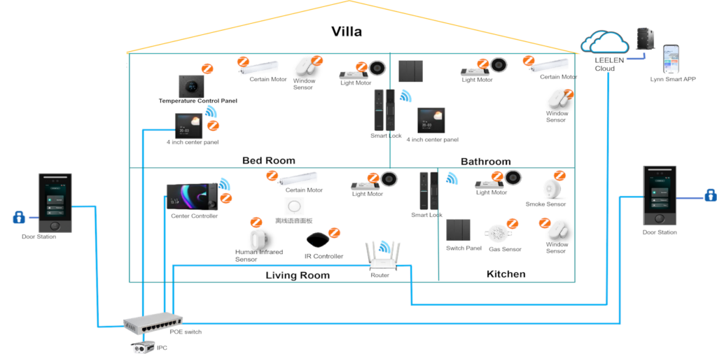 این اکوسیستم هوشمند، ادغام روان و ایمن دستگاههای مختلف را از طریق دو پروتکل ارتباطی قدرتمند Zigbee و Wi-Fi ممکن میسازد. با بهرهگیری از شبکههای مش (Mesh) Zigbee، دستگاههای کممصرف مانند سنسورها، سوئیچها، قفلها و سیستمهای روشنایی بهصورت پایدار، با مصرف انرژی بهینه و با پوشش گسترده به یکدیگر متصل میشوند. در کنار آن، پروتکل Wi-Fi نیز برای اتصال دستگاههای پهنباند و پرظرفیت مانند دوربینهای نظارتی، تلویزیونهای هوشمند، کنترلرهای مرکزی و سیستمهای صوتی استفاده میشود. این ترکیب هوشمندانه، یک زیرساخت ارتباطی قدرتمند، مقیاسپذیر و یکپارچه ایجاد میکند که امکان گسترش آسان سیستم را در آینده فراهم میآورد.